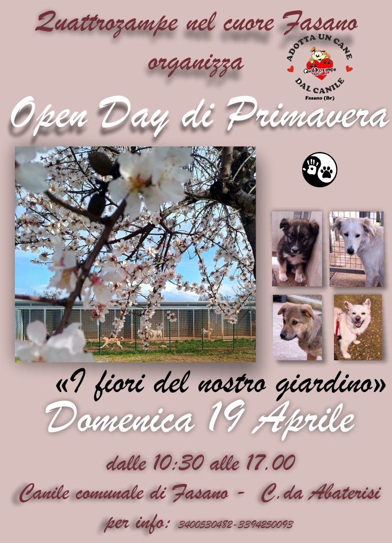 FASANO – La primavera sboccia al Canile Comunale di Fasano con un appuntamento speciale dedicato all’amore per gli animali. Domenica 19 aprile, dalle ore 10:30 alle 17:00, i cancelli della struttura in C.da Abaterisi si apriranno per l’atteso “Open Day di Primavera”.