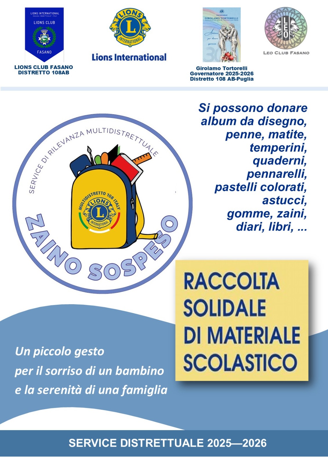 Fasano – Il Lions Club Fasano ed il Leo Club Fasano sostengono il service “Zaino sospeso”, iniziativa promossa a livello nazionale dal Multidistretto Lions 108 Italy.