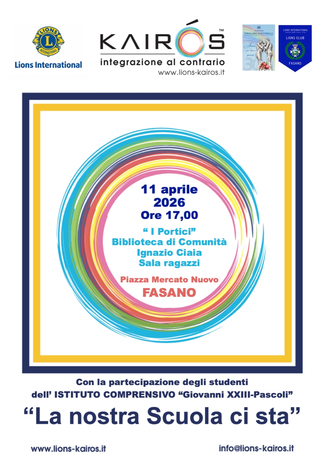 Fasano – Il Lions Club Fasano, sabato 11 aprile, alle ore 17,00, nella biblioteca di comunità “Ignazio Ciaia” di Fasano presenterà l’iniziativa “La nostra Scuola ci sta” nell’ambito del progetto Lions Kairòs che si prefigge di migliorare l’integrazione scolastica e sociale dei ragazzi.