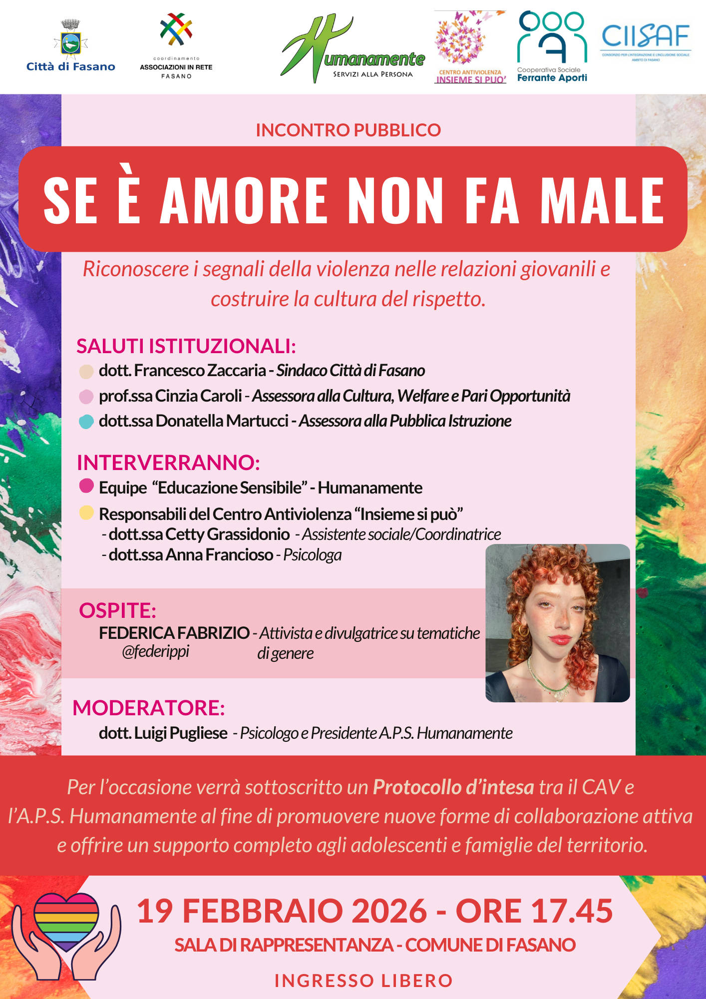 Fasano – L’Associazione di Promozione Sociale Humanamente ha organizzato un incontro pubblico dal titolo: “Se è amore non fa male – Riconoscere i segnali della violenza nelle relazioni giovanili e costruire la cultura del rispetto” che si terrà giovedì 19 febbraio, ore 17.45 presso la “Sala di Rappresentanza – Palazzo Città”.