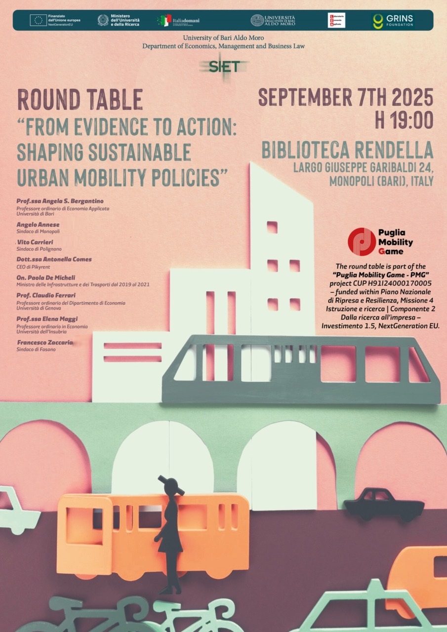 Un momento di particolare rilievo sarà la tavola rotonda “From evidence to action: shaping sustainable urban mobility policies – Dalle evidenze all’azione: disegnare politiche sostenibili per la mobilità urbana” -organizzata nell’ambito del progetto PNRR “Puglia Mobility Game” (PMG), e che si inserisce nelle attività scientifiche della SIET -, prevista domenica 7 settembre 2025, alle ore 19:00.L’iniziativa, pensata per stimolare il confronto tra esperti, istituzioni e operatori, rappresenta un’occasione di dialogo strategico sulle nuove forme di mobilità sostenibile, sugli strumenti di incentivazione e promozione e sulle politiche urbane per accompagnarne lo sviluppo. Interverranno la prof.ssa Angela S. Bergantino, ordinaria di Economia Applicata dell’Università di Bari e responsabile scientifica del progetto, Angelo Annese Sindaco di Monopoli, la dott.ssa Antonella Comes, CEO di Pikyrent, Vito Carrieri Sindaco di Polignano, l’on. Paola De Micheli, già Ministro delle Infrastrutture e dei Trasporti dal 2019 al 2021, il prof. Claudio Ferrari, ordinario dell’Università di Genova, la prof.ssa Elena Maggi ordinaria dell’Università dell’Insubria, e Francesco Zaccaria Sindaco di Fasano. L’incontro sarà un’occasione di confronto aperto tra accademia, imprese, istituzioni e amministrazioni locali sul tema della mobilità urbana sostenibile, con l’obiettivo di passare dalle evidenze scientifiche all’elaborazione di politiche concrete ed efficaci.
