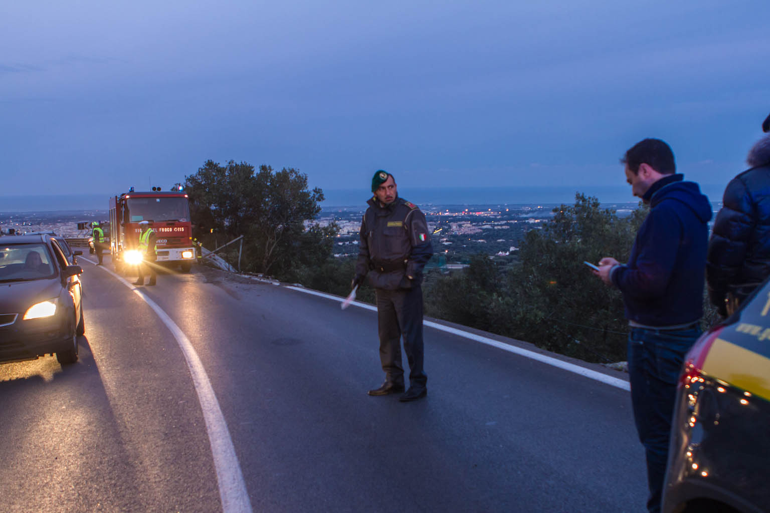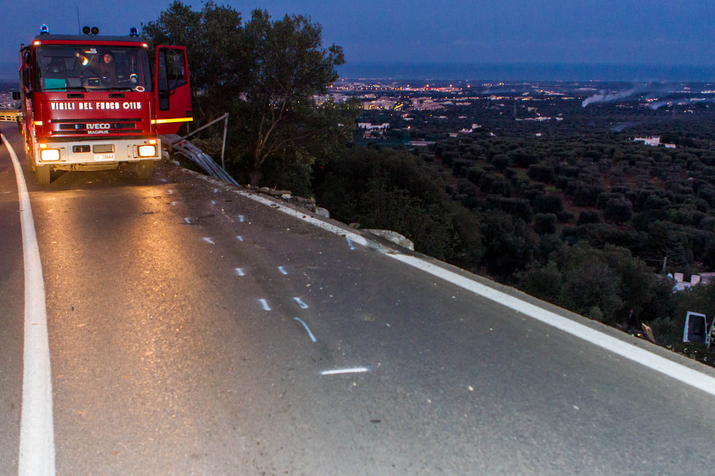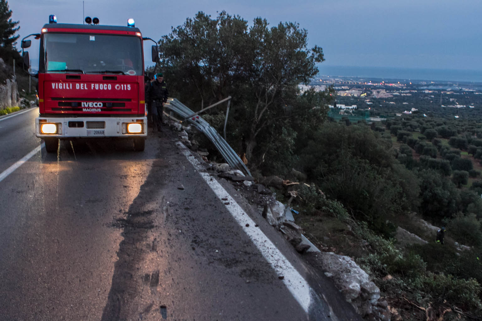 FASANO- Ancora un incidente sulla SS172, nei pressi della curva "Madonnina", dove un'autocisternina nel pomeriggio di oggi, 8 gennaio, è finita fuori strada precipitando nei terrazzamenti collinari adiacenti. (PER VEDERE LE FOTO CLICCA QUI) Incolume il conducente,  condotto comunque presso il nosocomio di Brindisi per accertamenti, che avrebbe perso il controllo del mezzo pesante il quale scivolando ha strappato trenta metri circa di guard-rail e danneggiato cavi telefonici ed alberi. L'autoarticolato è rotolato diverse volte prima di fermarsi, e sono tuttora impegnati i Vigli del Fuoco per mettere in sicurezza il mezzo scongiurando eventuali fughe del materiale contenuto nella cisterna, probabilmente gasolio​.