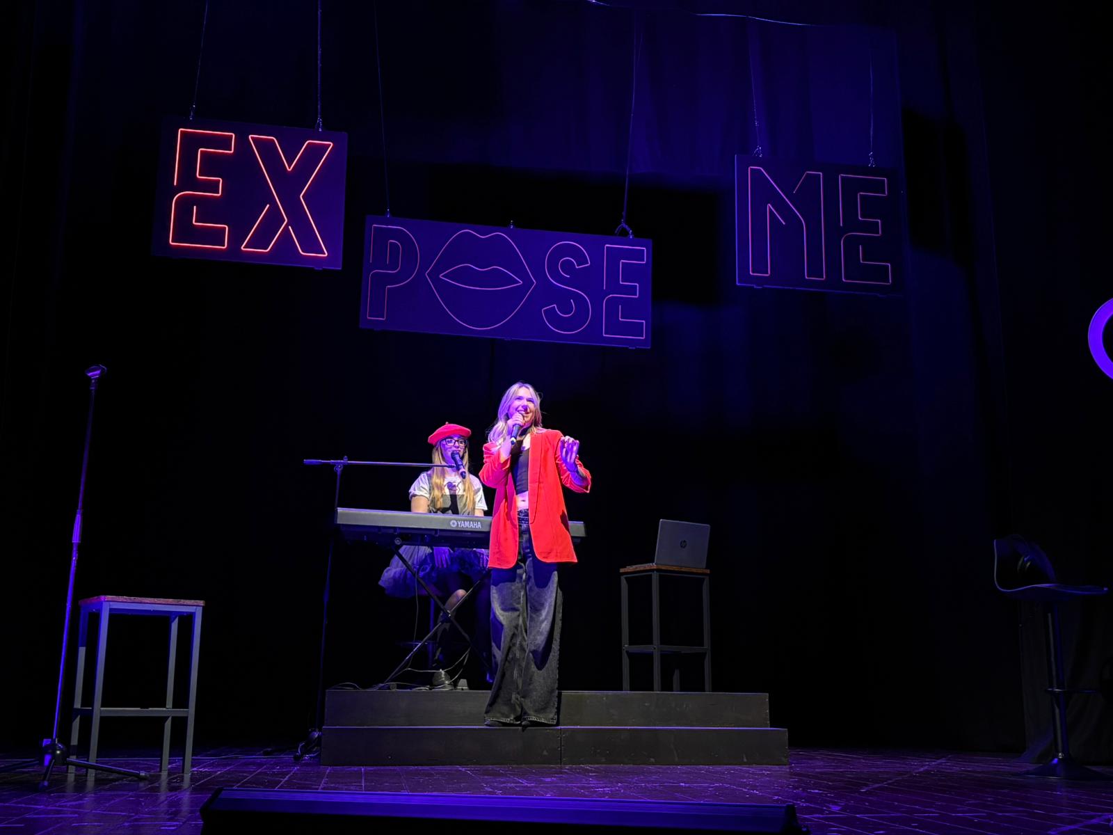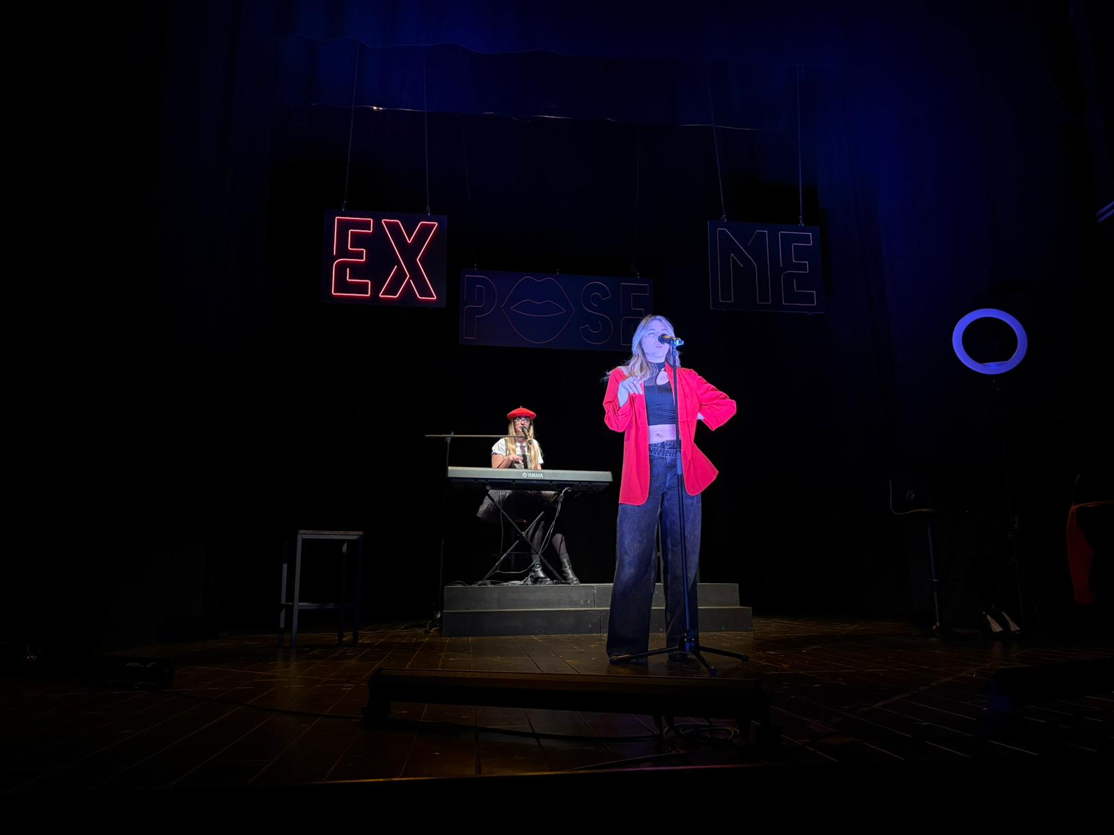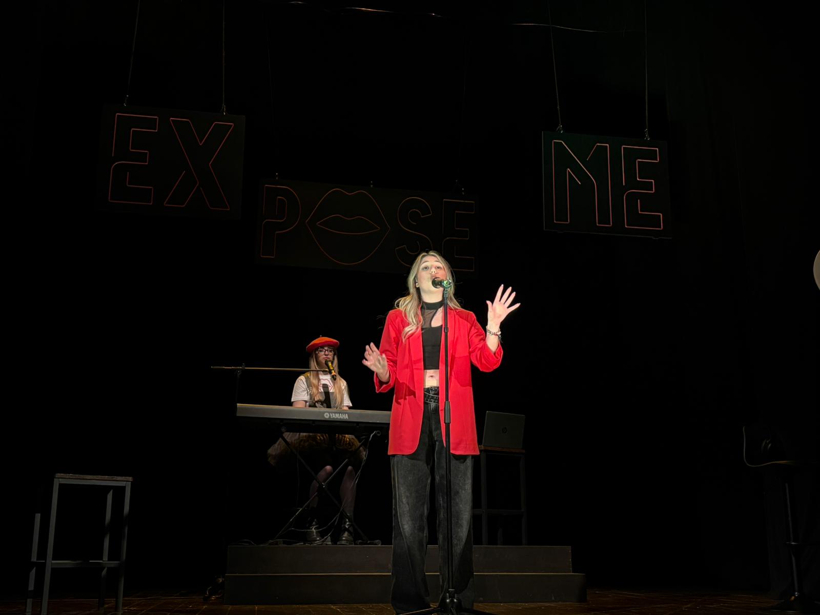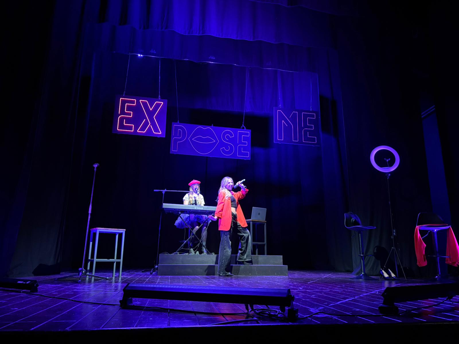 Domenica 26 aprile il Teatro Sociale ha accolto un testo sincretico: stand-up, autobiografia e commento autoriale, danza, musical. La drammaturgia di David Marzi – con l’aiuto regia di Teresa Cecere –, le musiche originali di Alessandra Orlando e Giulia Alò (tra cui la stessa Ex-pose-me), le coreografie di Francesco Biasi e l’interpretazione di Ilenia Sibilio – sul palco insieme a Giulia Alò – hanno dato vita a uno spettacolo dinamico e accattivante. La scelta di unire differenti linguaggi espressivi è vincente per un pubblico di adolescenti: Ex-pose-me, infatti, sarà portato nelle scuole superiori del territorio per quattro matinée.