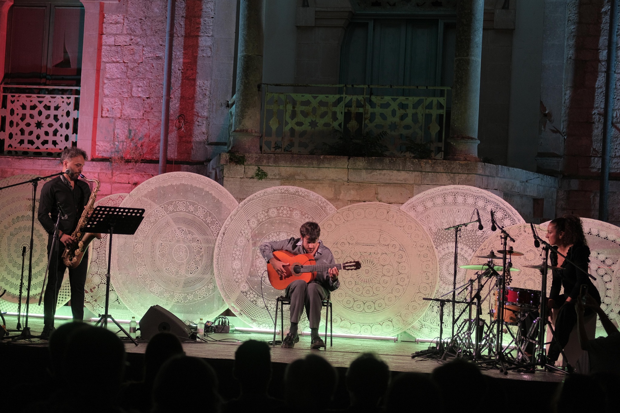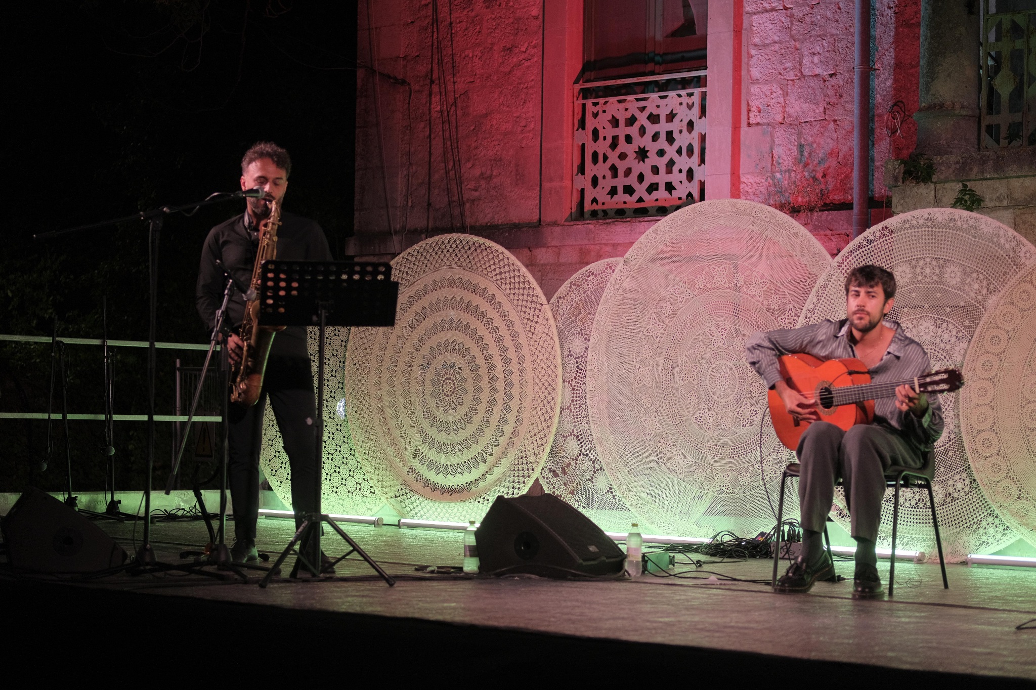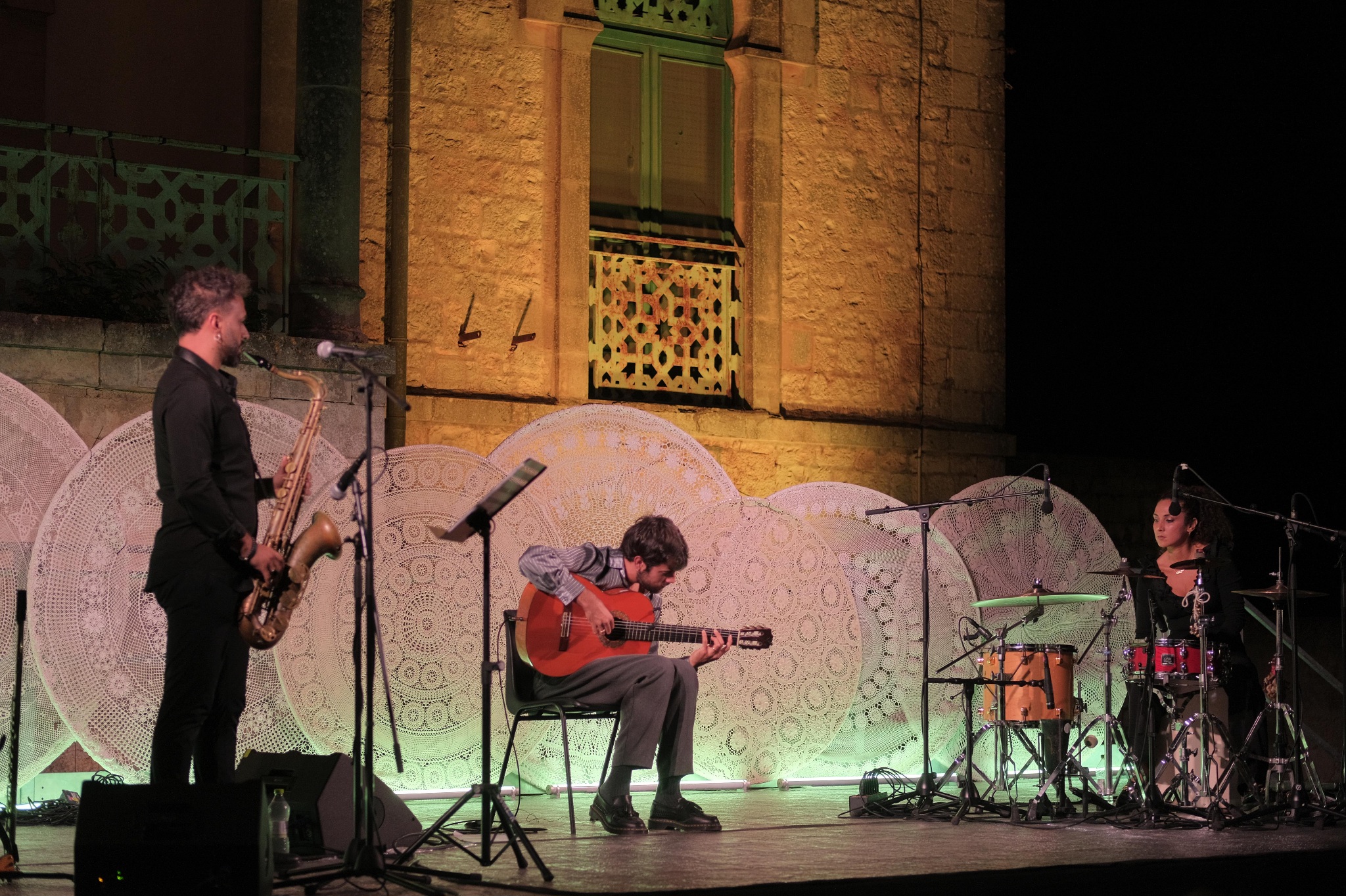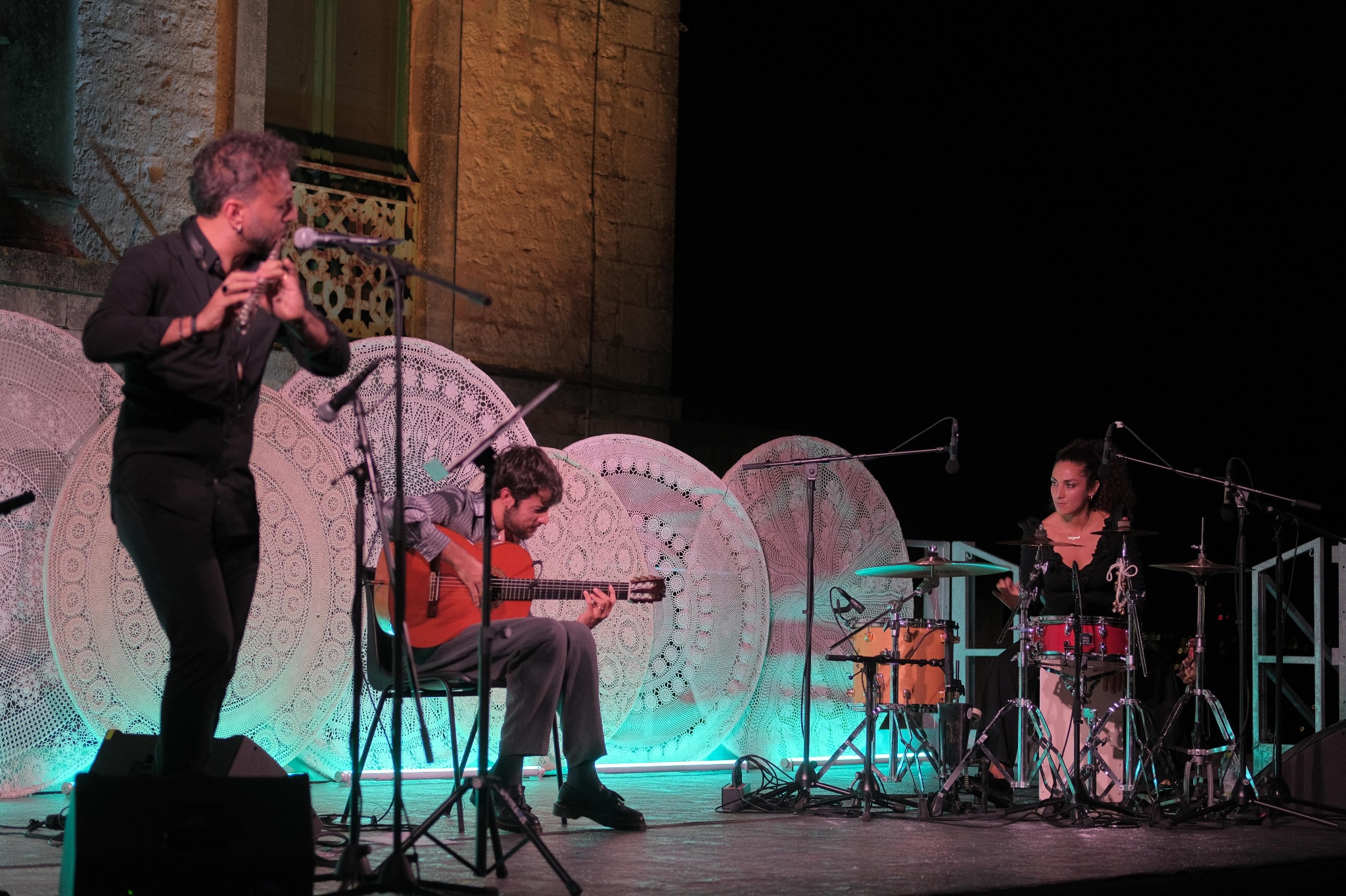 A seguire a salire sul palco è stato un altro trio di giovani musicisti, un italiano e due spagnoli, che hanno scambiato idee e ispirazioni in una residenza artistica dal titolo emblematico: Soffi Mediterranei. Obiettivo della residenza: scambio, contaminazione, sperimentazione. E così è stato: il concerto di ieri è stato il risultato di un’unione simbolica di tutto il Mediterraneo; il flamenco, le sonorità del sud Italia, i ritmi nordafricani e le sperimentazioni jazz hanno trovato una sintesi in un concerto altresì peculiare, immersivo e, a dir la verità, non sempre facilmente accessibile al pubblico. A esibirsi sono stati il flautista italiano Paolo Pace, il chitarrista flamenco Victor Franco e la percussionista Nasrine Rahmani, specialista di cajón flamenco.