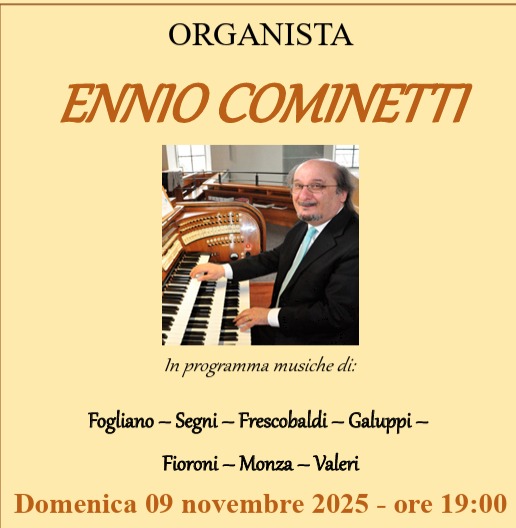 Domenica 9 novembre 2025, alle ore 19:00, nella suggestiva Chiesa del Purgatorio (Corso Vittorio Emanuele, 16 – Fasano), si esibirà Ennio Cominetti, celebre organista, direttore e compositore di fama internazionale. L’ingresso è libero.