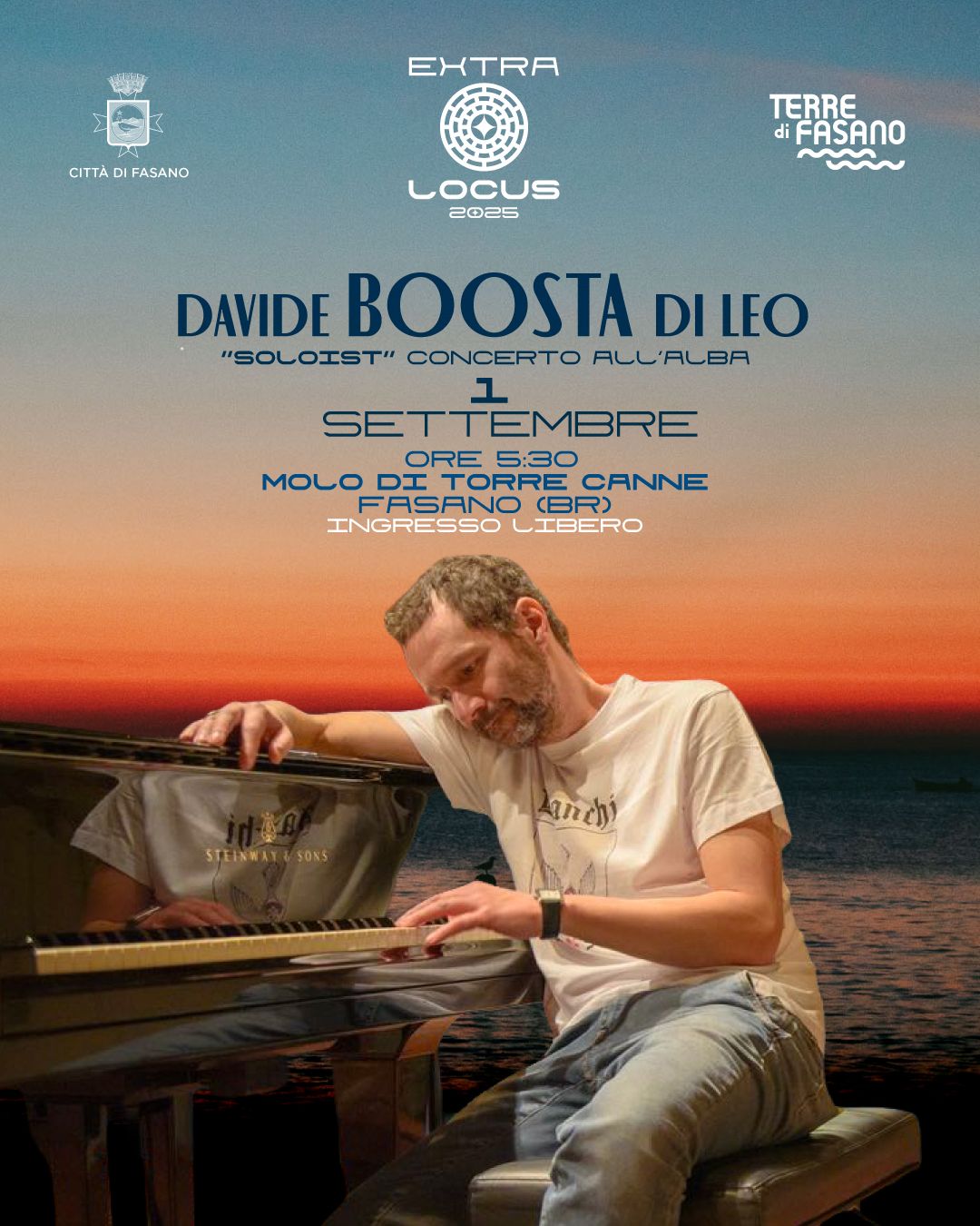 Fasano – Continua la collaborazione fra il Comune di Fasano ed il Locus Festival con un prezioso evento extra: lunedì 1° settembre, le prime luci dell’amba (ore 5.30) al Molo di Torre Canne faranno da scena al concerto di Davide “Boosta” Dileo”, musicista, DJ, compositore, produttore e sound artist, co-fondatore e tastierista dei Subsonica. L’evento è a ingresso libero e gratuito.