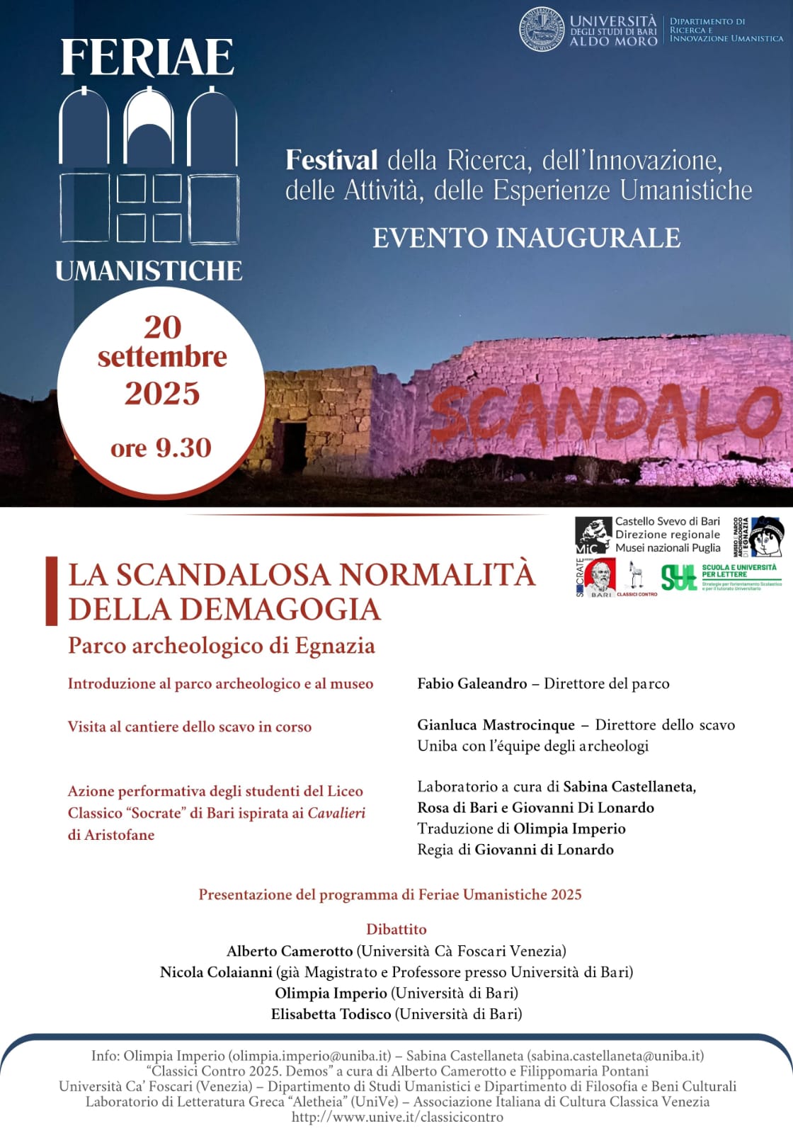 Fasano – Il 20 settembre 2025 il Parco Archeologico di Egnazia farà da cornice all’evento inaugurale di “Feriae Umanistiche”, il Festival della Ricerca e dell’Innovazione Umanistica promosso dall’Università degli Studi di Bari. L’appuntamento è alle ore 9:30 per un’intera giornata dedicata a un tema tanto attuale quanto controverso: “La Scandalosa Normalità della Demagogia”.