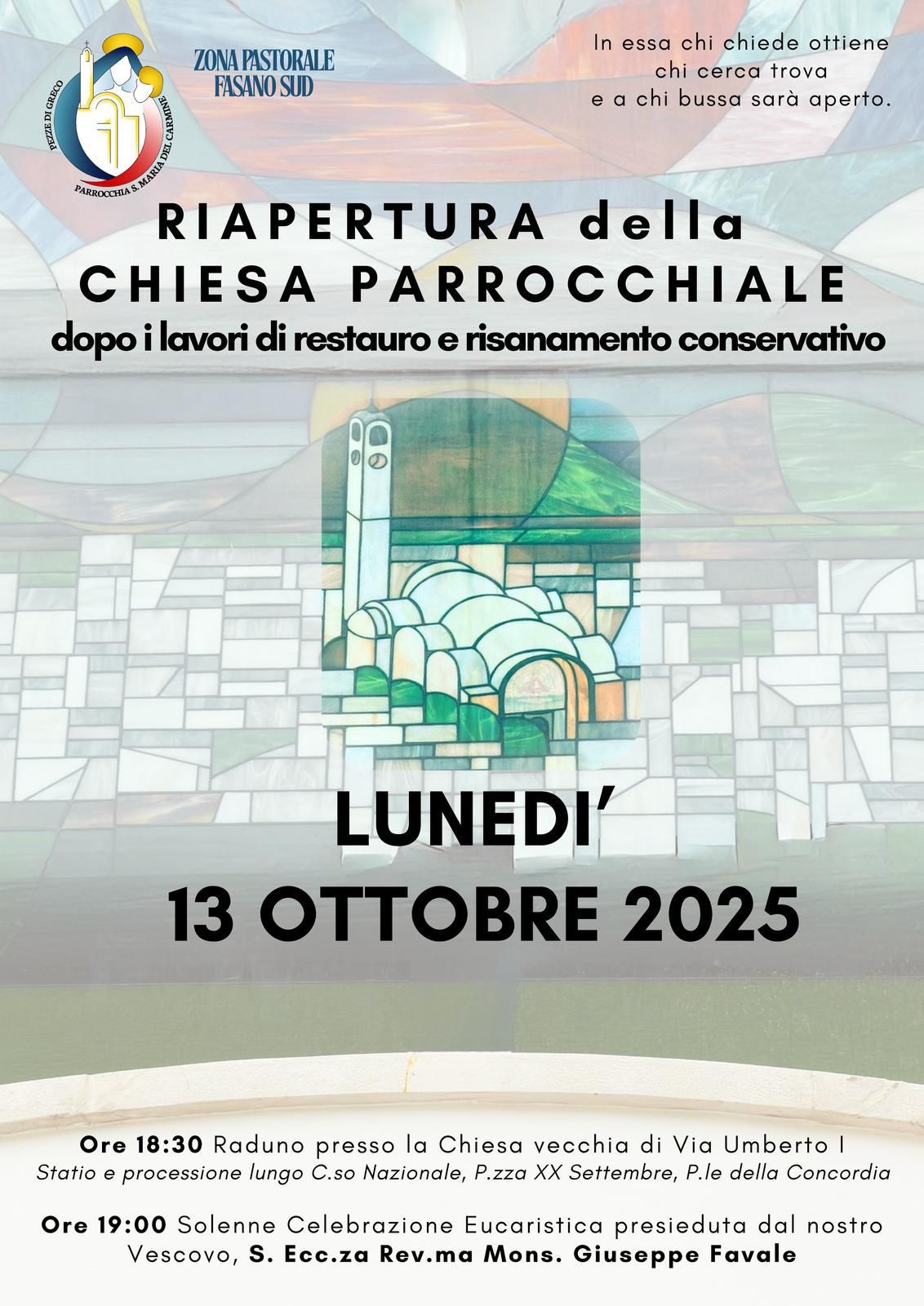 L’appuntamento è fissato per lunedì 13 ottobre 2025, una data che segnerà il ritorno della parrocchia, punto di riferimento spirituale della Zona Pastorale Fasano Sud, nella sua sede rinnovata. L’annuncio esprime la speranza e la fede della comunità con la citazione evangelica: “In essa chi chiede ottiene, chi cerca trova e a chi bussa sarà aperto.”