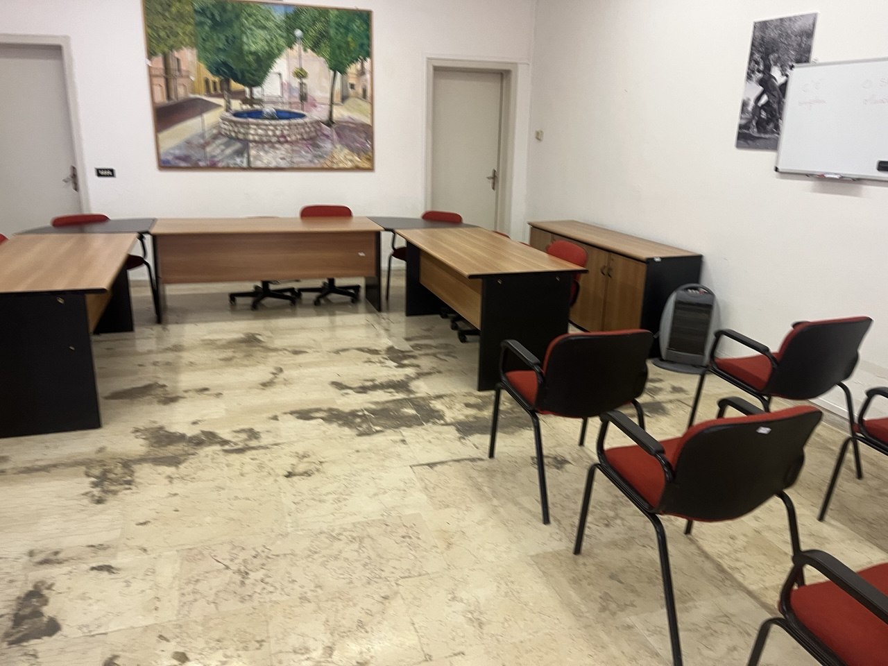 - Danni alla pavimentazione: il marmo del pavimento ha subito un processo di annerimento dovuto all’umidità di risalita e alla scarsa manutenzione.