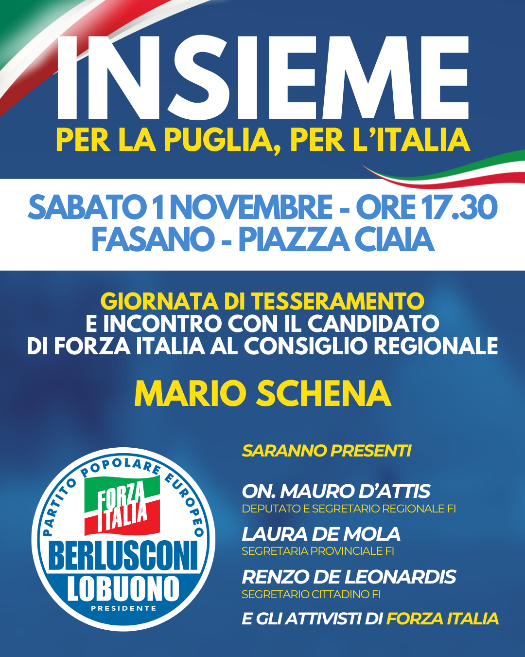 Oltre alla campagna di tesseramento al partito azzurro, che sta avendo luogo in tutto il Paese, il candidato al Consiglio regionale Mario Schena incontrerà i cittadini e i sostenitori per presentare le sue proposte per la Puglia dei prossimi cinque anni.