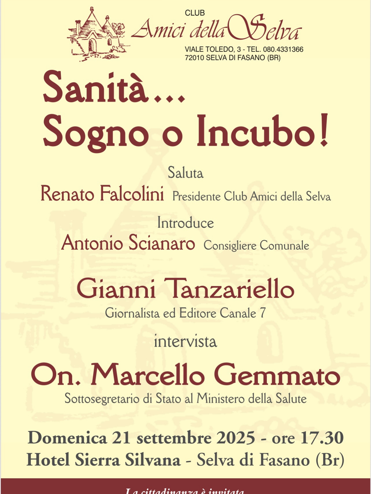 Selva di Fasano – Domenica 21 settembre, alle ore 17.30, l’Hotel Sierra Silvana a Selva di Fasano ospiterà un importante incontro organizzato dal Club Amici della Selva, in collaborazione con il consigliere comunale Antonio Scianaro. L’evento, dal titolo evocativo “Sanità… Sogno o Incubo!”, si propone di affrontare uno dei temi più sentiti e dibattuti del nostro tempo.