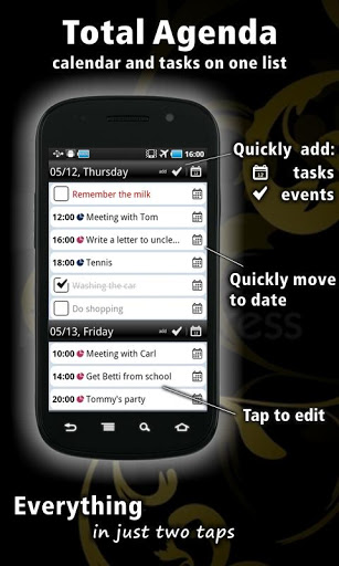 DejaOffice: non è né un calendario o né un elenco delle attività, ma tutti i due insieme. Sembra un piccolo ufficio all'interno del nostro Android. L'applicazione include la gestione completa e mirata dei contatti, calendario, attività, note ed anche il controllo delle spese. E 'altamente configurabile, e permette la sincronizzazione dei dati con tutto il sistemaAndroid. C'è anche una versione desktop di pagamento. Anche se le opzioni sono diverse, gli utenti la considerano un po’ comlicata se ci sono molte attività quotidiane da aggiungere.
