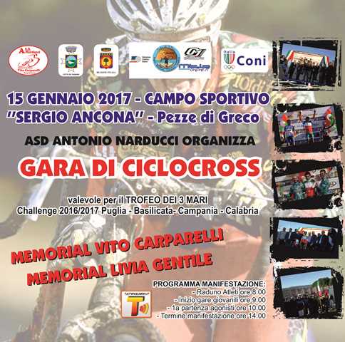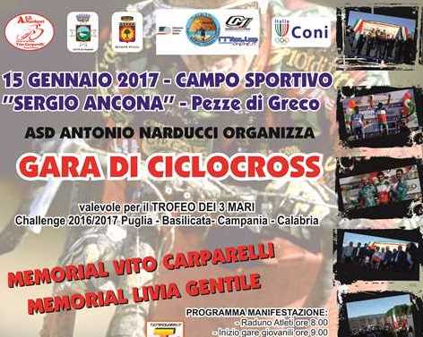 FASANO – Si disputerà domenica 15 GENNAIO, su un percorso allestito nei pressi del campo sportivo "S. Ancona" di Pezze di Greco, il memorial "Vito Carparelli" e "Livia Gentile" di ciclocross. La manifestazione, organizzata dall'Asd "A. Narducci" di Pezze di Greco è stata inserita anche come tappa del Trofeo 3 Mari (Challenge Calabria – Puglia – Campania – Basilicata 2016 -2017).