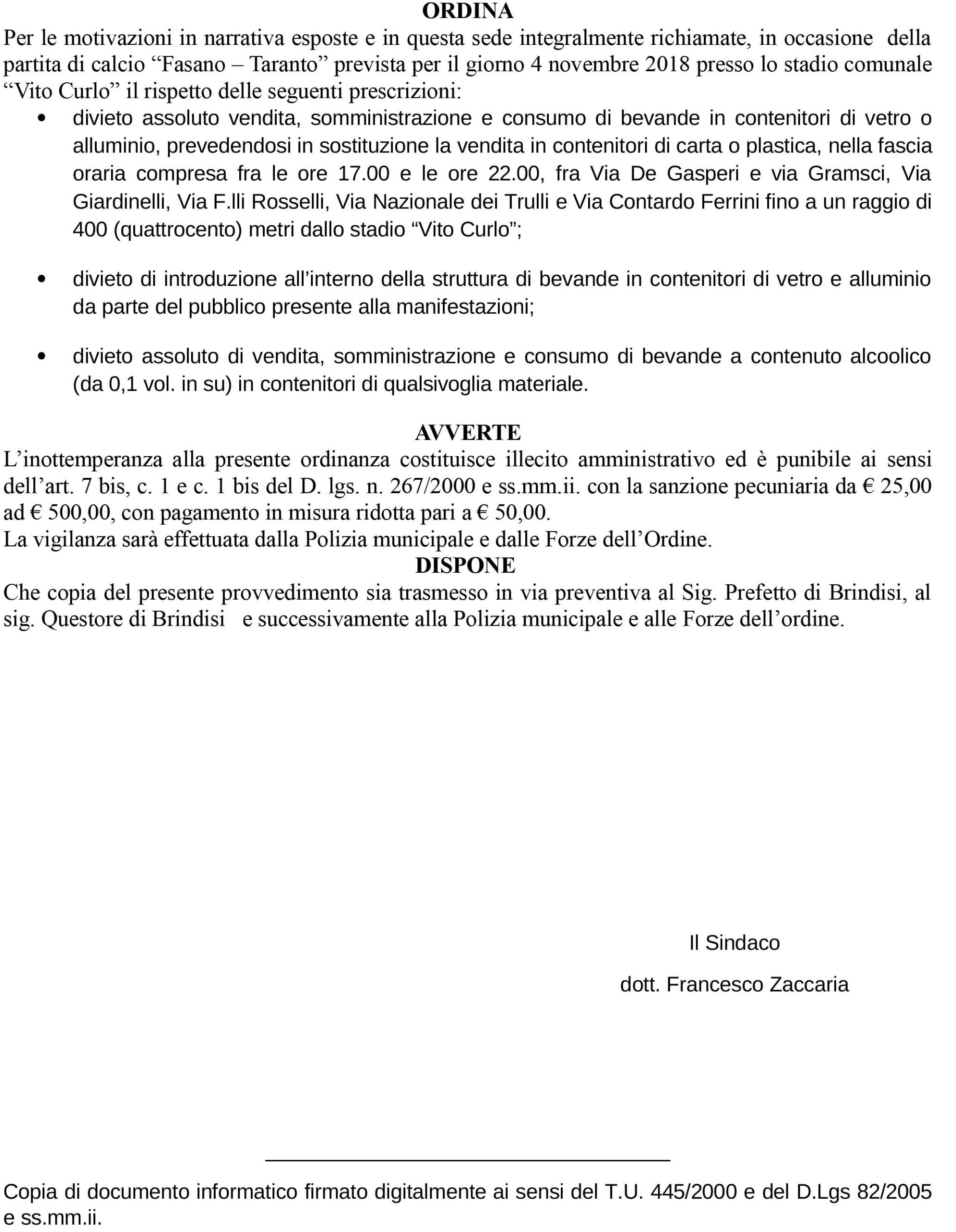 Divieto di vendita, somministrazione e consumo di bevande a contenuto alcoolico in occasione dello svolgimento della partita di calcio 'Fasano-Taranto' di domenica 4 novembre 2018