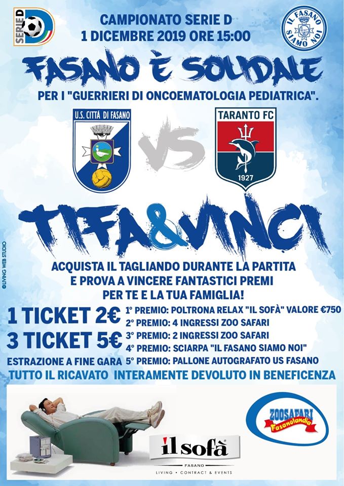 L’intero ricavato verrà devoluto in beneficenza per “i guerrieri di oncoematologia pedriatica” di Bari. Appuntamento dunque a domenica 1° dicembre alle ore 15:00 per assistere allo spettacolo di Fasano-Taranto. Arbitrerà la gara il signor Roberto Lovison di Padova.