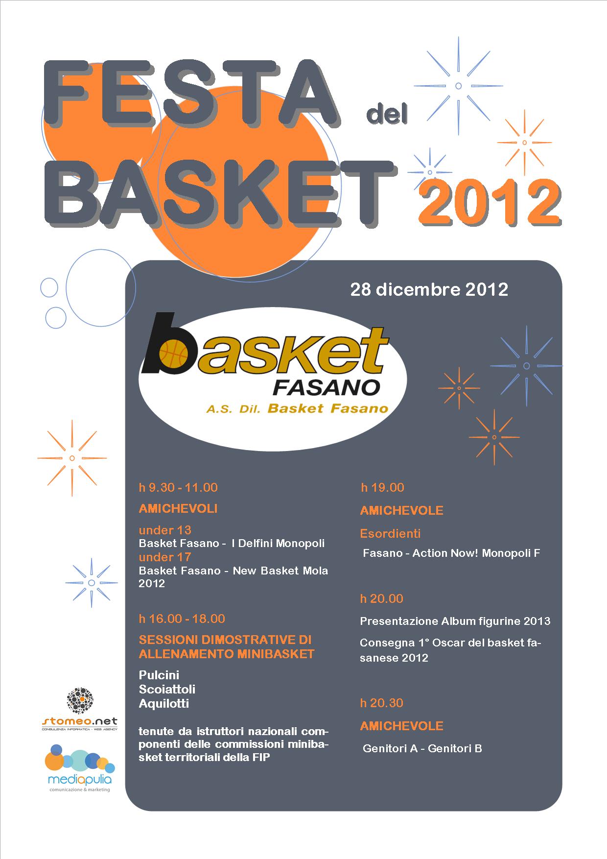 Il 28 dicembre inoltre si terrà la Festa del Basket 2012. Tutti i protagonisti dell’anno che sta per concludersi si troveranno al tensostatico per celebrare i traguardi raggiunti dalla società del Basket Fasano. La festa comincerà la mattina alle 9.30, con le amichevoli tra l’under 13 biancoazzurra di coach Ciccio Colucci e i pari età de I Delfini di Monopoli, allenati da coach Antonio Alba. A seguire l’amichevole tra l’under 17 di coach Colucci e i coetanei del New Basket Mola 2012 di coach Francesco Elefante. Nel pomeriggio, a partire dalle 16.00, ci saranno delle speciali sessioni di allenamento per i bambini del minibasket, Pulcini, Scoiattoli e Aquilotti, tenute da tre istruttorinazionali, componenti delle commissioni minibasket territoriali della FIP.