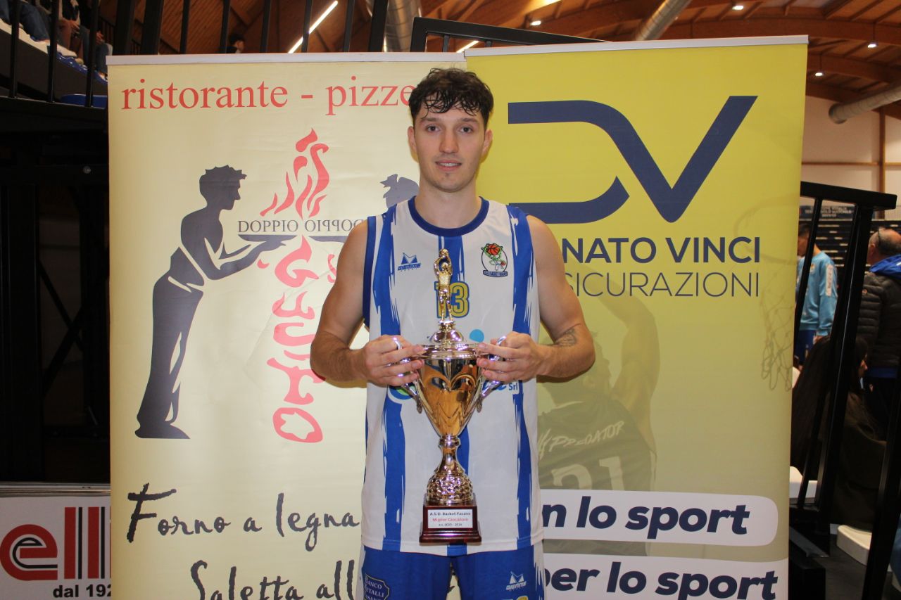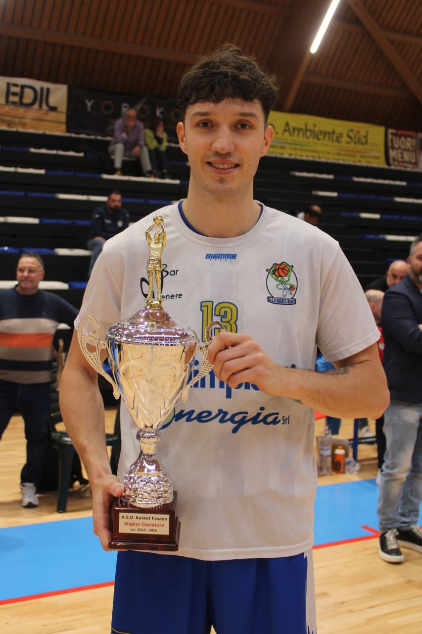 Fasano – Durante l'intervallo di Pugliampianti Energia Fasano – Basket Francavilla 1963 la stampa sportiva fasanese e i tifosi hanno premiato la guardia italo-argentina Joaquin Acuña come miglior giocatore della stagione 2023/2024. Il premio, finanziato dalla Donato Vinci Assicurazioni e ormai giunto alla quattordicesima edizione, è stato consegnato da Andrea Belfiore, ex presidente dell’ABF Fasano, la precedente denominazione dell’“ASD Basket Fasano”.