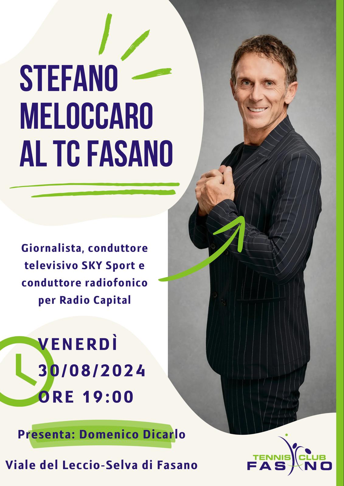Per Meloccaro, una delle grandi firme del tennis italiano, si tratta di un ritorno al Torneo Open dopo la partecipazione alla scorsa edizione, fortemente voluta dal Presidente del TC Fasano Stefano Lozupone e dall'intero Consiglio Direttivo. Stefano Meloccaro dialogherà con Domenico Dicarlo, giornalista di Canale 7 e grande appassionato di tennis, in un talk che coinvolgerà anche i bambini della Scuola Tennis.