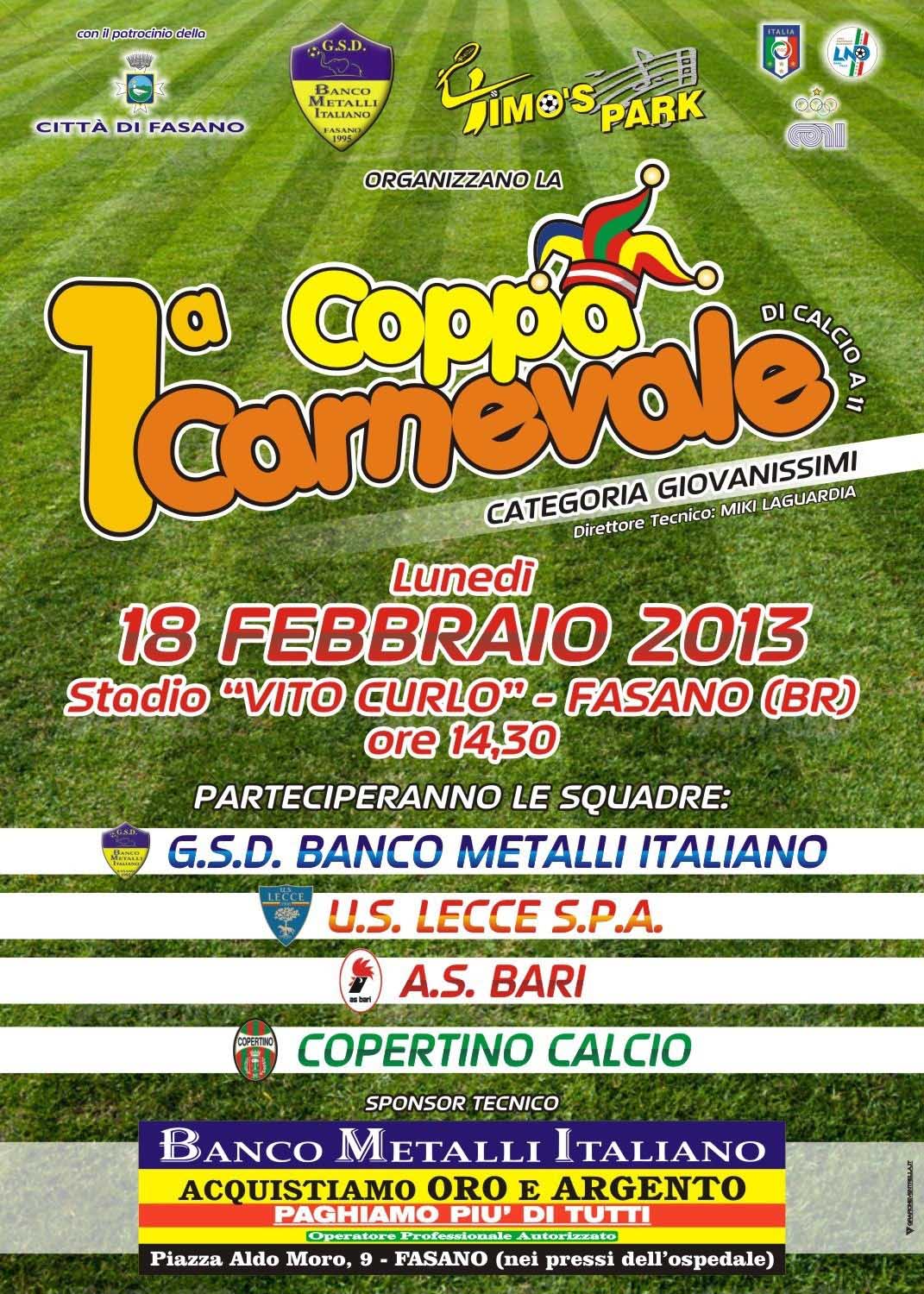 FASANO -Si disputerà lunedì 18 febbraio la prima edizione della "Coppa del Carnevale", manifestazione sportiva di calcio, dedicata ai ragazzi nati dal 1998 al 1999 (categoria Giovanissimi). Al quadrangolare prenderanno parte le blasonate società sportive del Lecce e del Bari, oltre al Copertino (Le) ed ai padroni di casa del GSD Banco Metalli Fasano, società organizzatrice della manifestazione. Con il patrocinio del Comune e dell’Assessorato allo Sport, il quadrangolare si svolgerà allo stadio Vito Curlo dalle 14.30 in poi, sotto gli occhi attenti del direttore tecnico della manifestazione, Miki Laguardia, portiere fasanese in forza al Gallipoli.