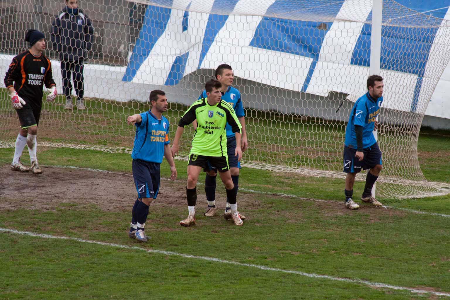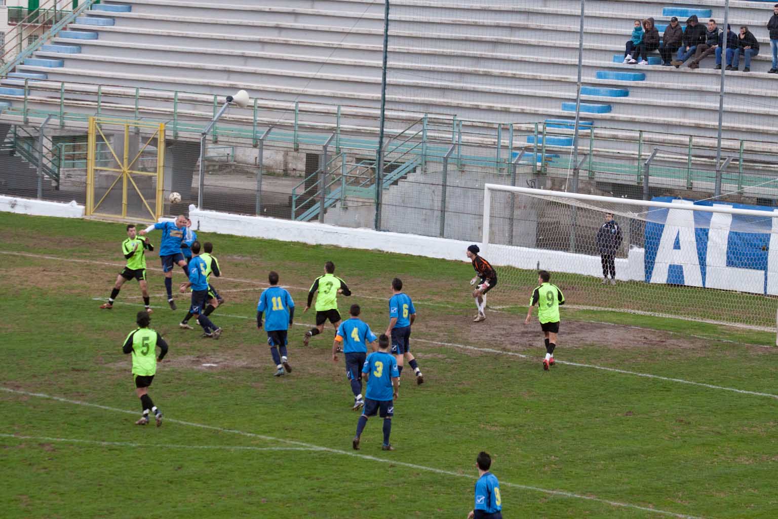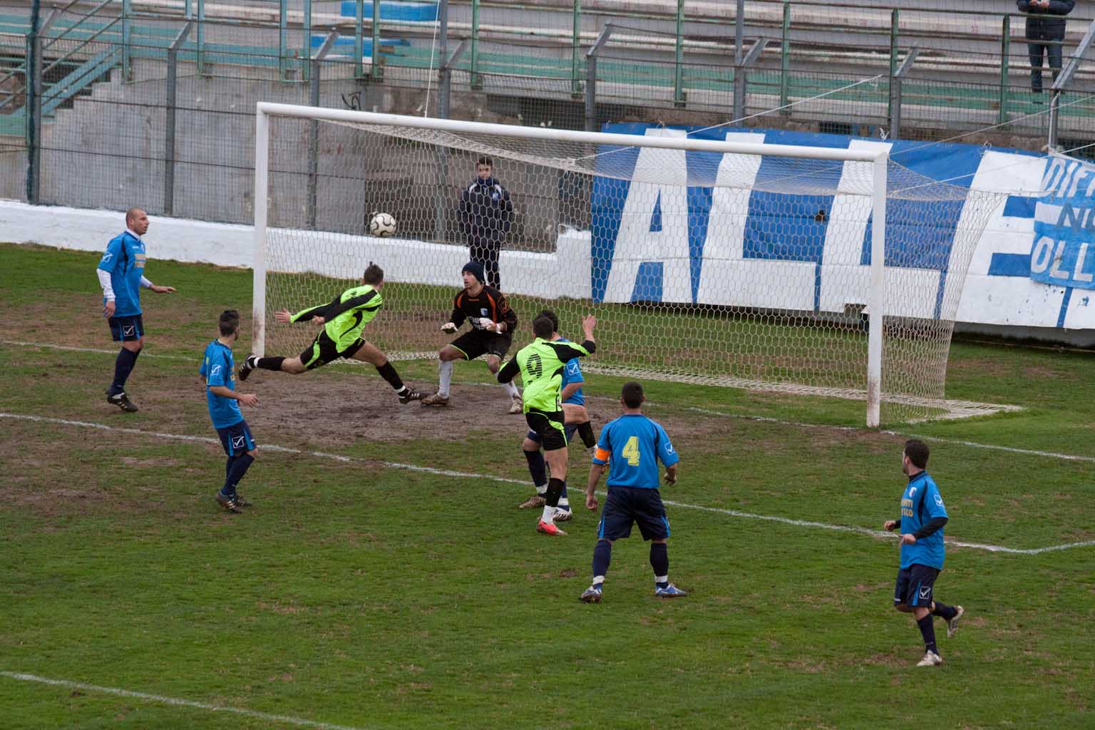 Il Fasano parte bene e già al 2’ Dibello calcia alto dopo una bella percussione di Patronelli. Ma il Mesagne deve vincere per forza e aumenta subito i ritmi della gara. Al 6’ un tiro di Patronelli viene ribattuto e due minuti dopo è Schiavone a calciare fuori. In questa occasione l’attaccante fasanese pecca d’egoismo potendo appoggiare al centro un facile pallone. Il Fasano comincia a far sul serio e Dibello e Chiatante sfiorano la rete del vantaggio. La superiorità territoriale del Fasano viene concretizzata al 14’ da Dibello che di testa appoggia in rete un lob di Schiavone involatosi sulla corsia di destra. Sulle ali dell’entusiasmo i fasanesi rischiano di raddoppiare al 16’ con Cosenza che lascia partire un fendente da fuori area alto di poco. Al 20’ si vede il Mesagne dalle parti di Comes: Giudice calcia una punizione ma è attento il portiere biancazzurro a deviare in corner. Al 23’ è ancora Fasano: Dibello colpisce in pieno la traversa a portiere battuto. Al 30’ punizione di Iunco ribattuta con i pugni da Comes. Al 33’ Schiavone viene anticipato dal portiere avversario dopo un bel traversone di Cosenza. Al 35’ contropiede del Fasano con Patronelli che mette in affanno la retroguardia avversaria. Un minuto dopo Valentini spedisce di testa, di poco al lato, un corner di Dibello. Ci riprova al 38’ anche Cosenza il cui tiro viene parato.