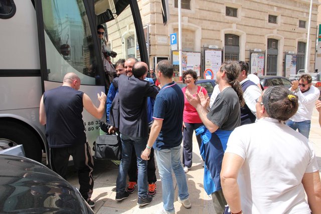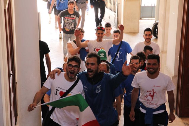 FASANO – I Campioni d'Italia sono tornati in città: questa mattina (venerdì 23 maggio) giocatori, dirigenti e tecnici della Junior Fasano hanno fatto rientro da Bolzano, dove ieri sera hanno vinto lo scudetto contro la squadra padrona di casa. I festeggiamenti e le emozioni per il meritatissimo trionfo sono proseguiti in piazza Ciaia e nel Palazzo municipale, dove la squadra è stata accolta dal vicesindaco Gianleo Moncalvo e dagli assessori Laura De Mola, Renzo De Leonardis, Nicola Mola e Vito Martucci per le congratulazioni di rito.
