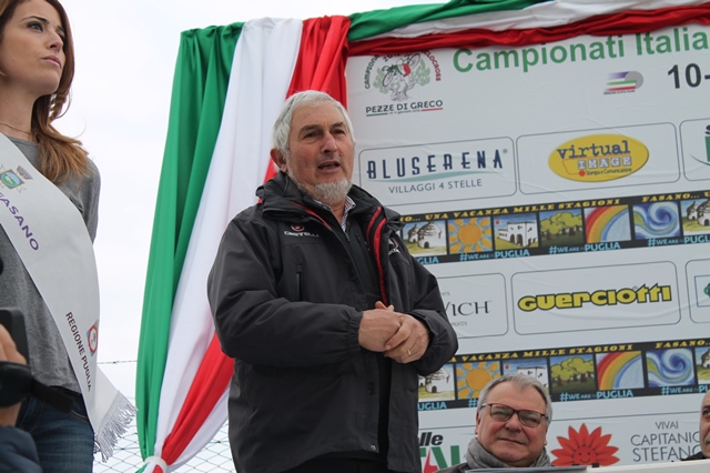 "E' un posto d'eccellenza" ha esordino invece Michieletto facendo riferimento allo splendido scenario che si ritroveranno davanti i corridori giunti da tutta Italia. "Devo dire che l'organizzazione mi ha stupito e abbiamo fatto bene a scegliere Pezze di Greco come sede di questi campionati – ha continuato il responsabile della Federazione -. Qui è bello tutto e sono sicuro che sarà una grande manifestazione". Il presidente Antonio Zizzi ha voluto invece ricordare nel suo intervento Vito Carparelli (socio della Narducci deceduto a causa di un incidente stradale) e Livia Gentile (moglie di Vito Di Tano sempre vicina alle sorti del sodalizio frazionale). Zizzi ha anche ringraziato tutti i volontari che si sono spesi negli ultimi mesi per allestire il percorso e per organizzare nei minimi dettagli l'evento. Il consigliere Zaccaria ha voluto fare il suo personale plauso ai suoi concittadini per il lavoro svolto scommettendo sulla buona riuscita dell'evento.