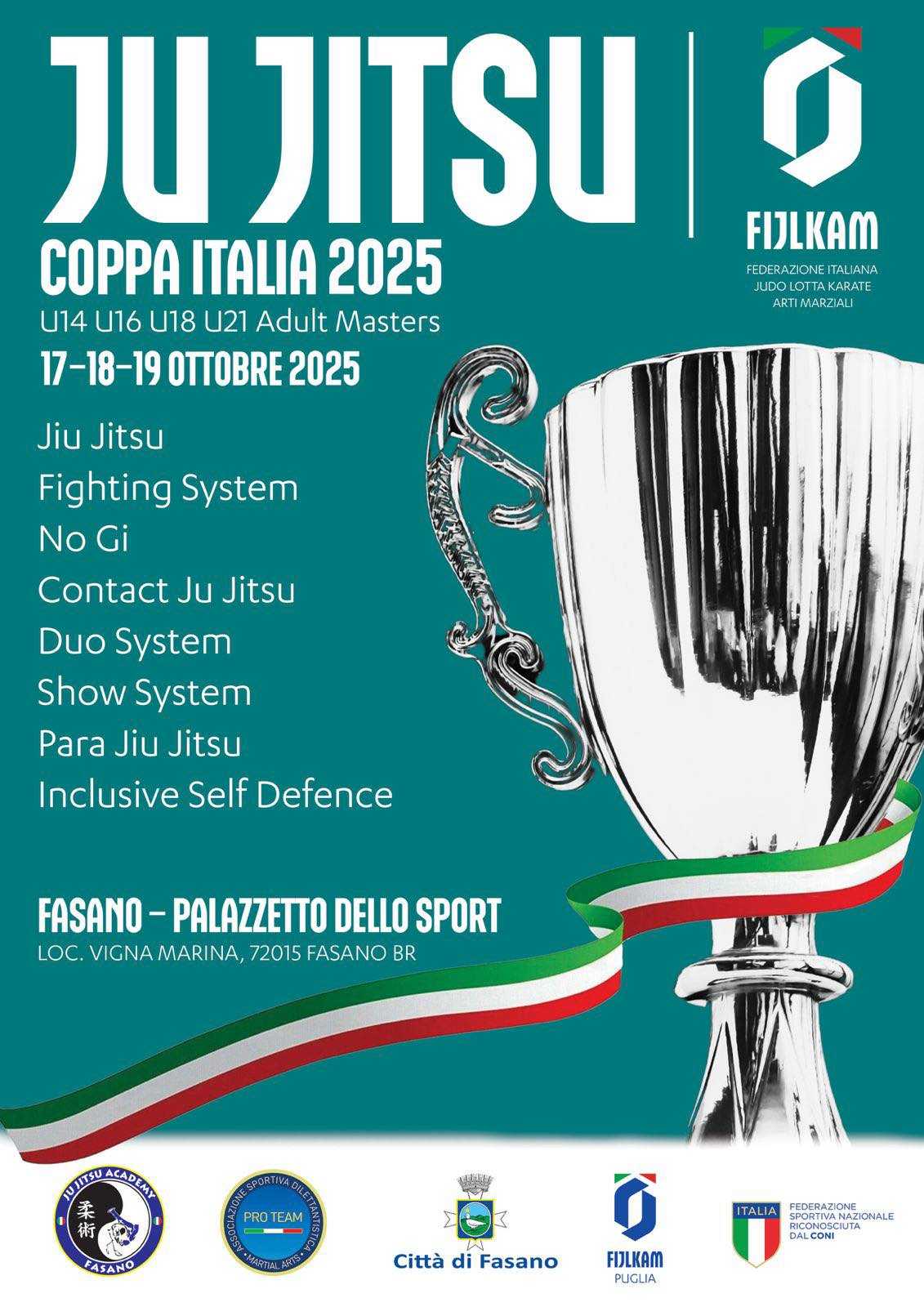 La Coppa Italia di Ju Jitsu 2025 è organizzata con il patrocinio e il supporto di importanti realtà, tra cui il Comune di Fasano, la FIJLKAM Puglia e la Ju Jitsu Academy Fasano, a testimonianza del forte impegno congiunto per la promozione dello sport e dei suoi valori.