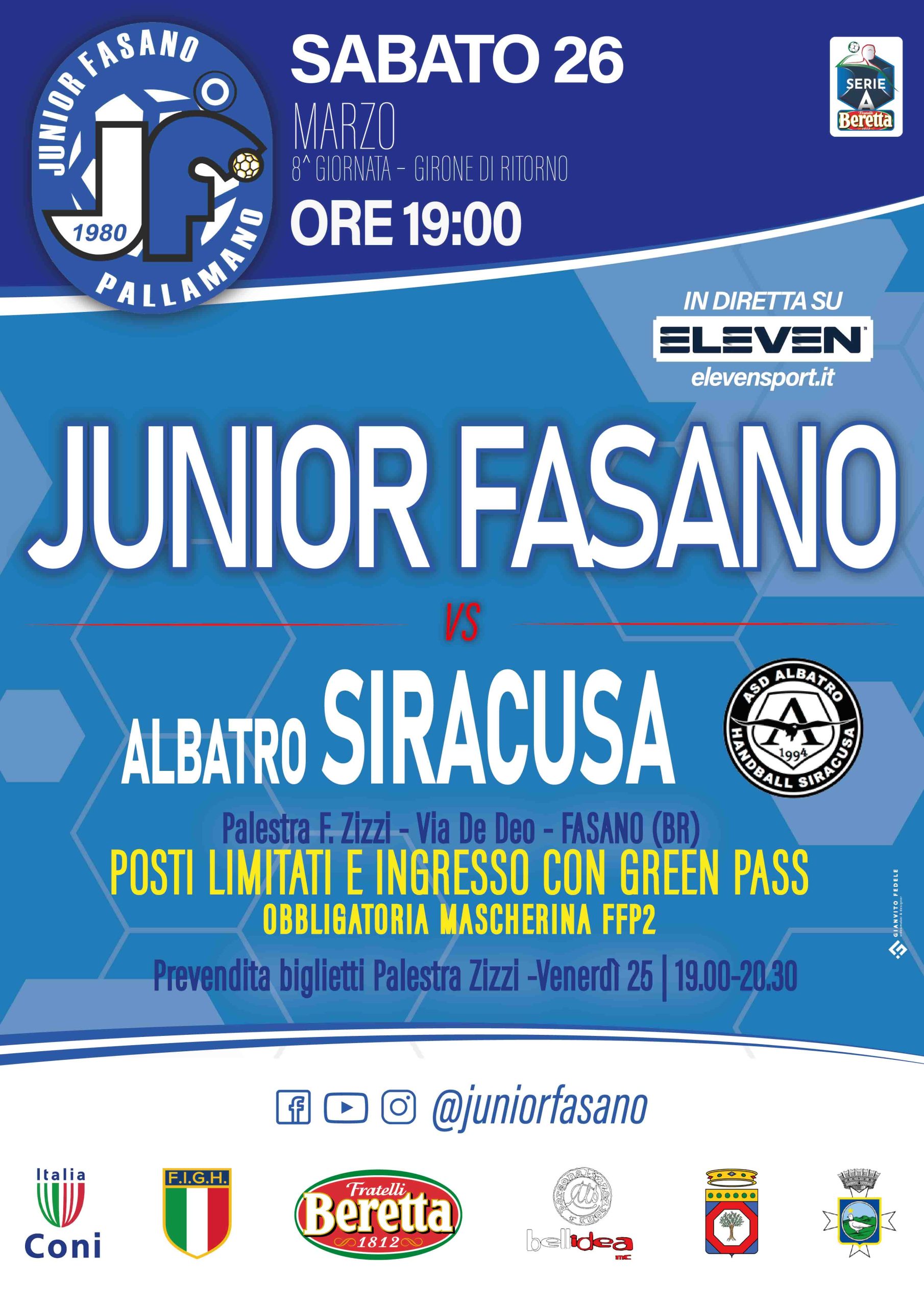 Per assistere al match tra Junior Fasano e Siracusa, in programma alle ore 19 di sabato 26 marzo, occorrerà dunque munirsi di titoli di ingresso, disponibili al prezzo di 5€ (senza alcuna distinzione di età) in prevendita esclusivamente nella giornata di venerdì 25 febbraio, dalle 19 alle 20.30 nella palestra Zizzi, e, solo in caso di eventuali biglietti residui, al botteghino prima della gara. Al fine di velocizzare le procedure di controllo, è opportuno per gli spettatori giungere con congruo anticipo in palestra, raggiungendo poi il posto prescelto.