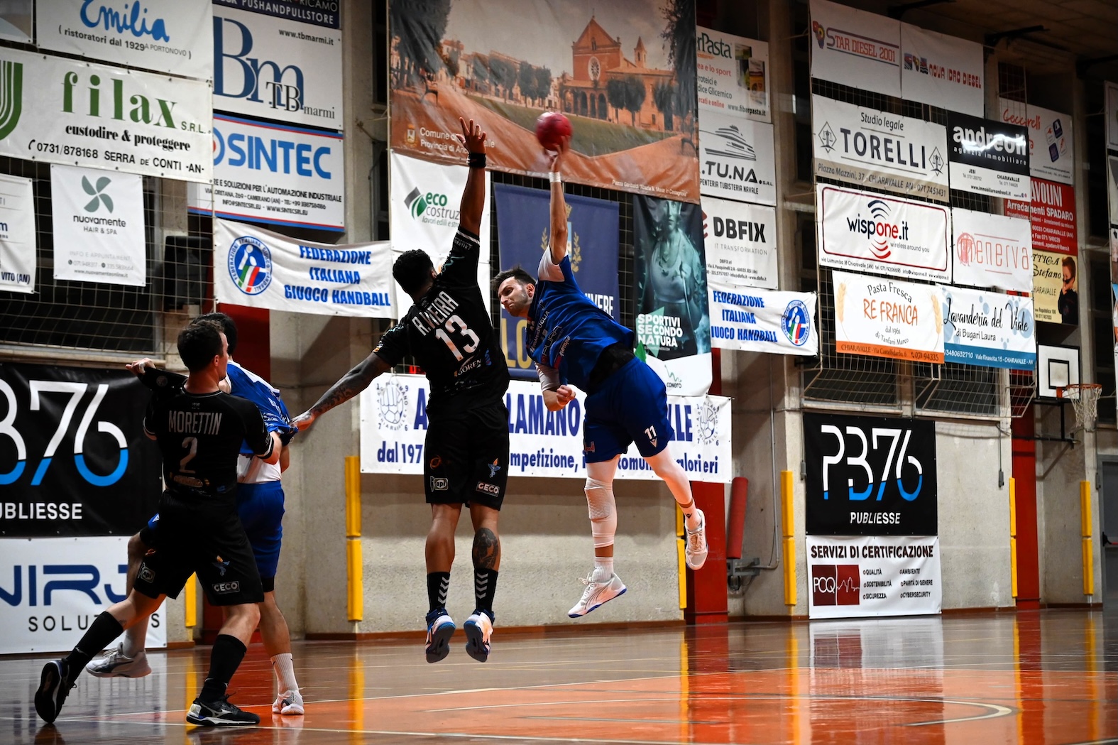 Dopo un primo tempo per buona parte equilibrato con le difese sugli scudi (4-4 al 10’, 8-8 al 21’), i padroni di casa piazzano il primo break di serata, portandosi prima sul +2 (10-8 al 25’) e poi sul + 3 (12-9 al 29’). I fasanesi, privi di Leban e Beharevic, tornano subito a contatto e piazzano il sorpasso con un perentorio contro-parziale ad inizio ripresa, passando dal 14-11 del 33’ al 14-18 del 39’, ma la formazione marchigiana non molla ed al 48’ è di nuovo parità (19-19).