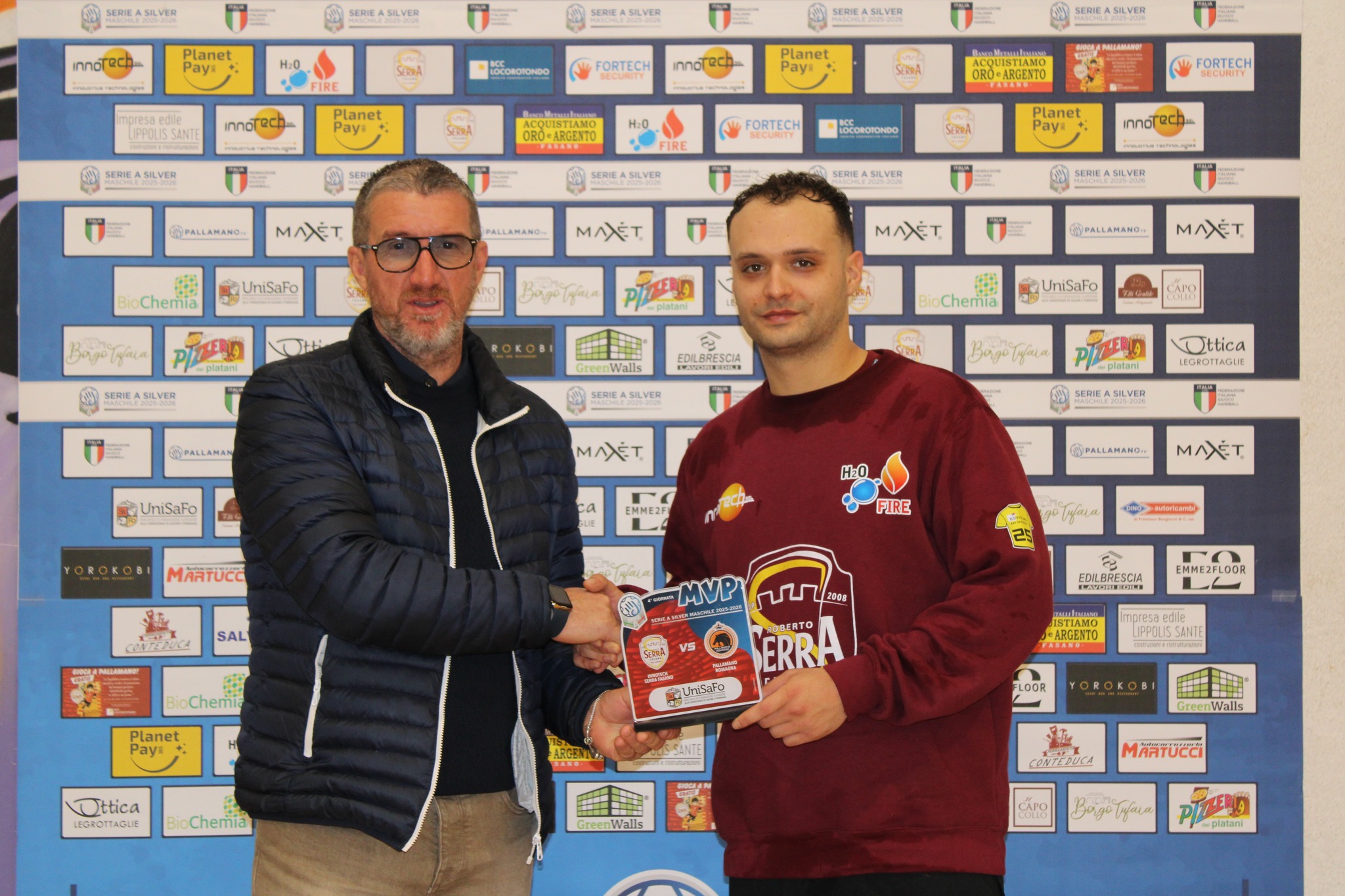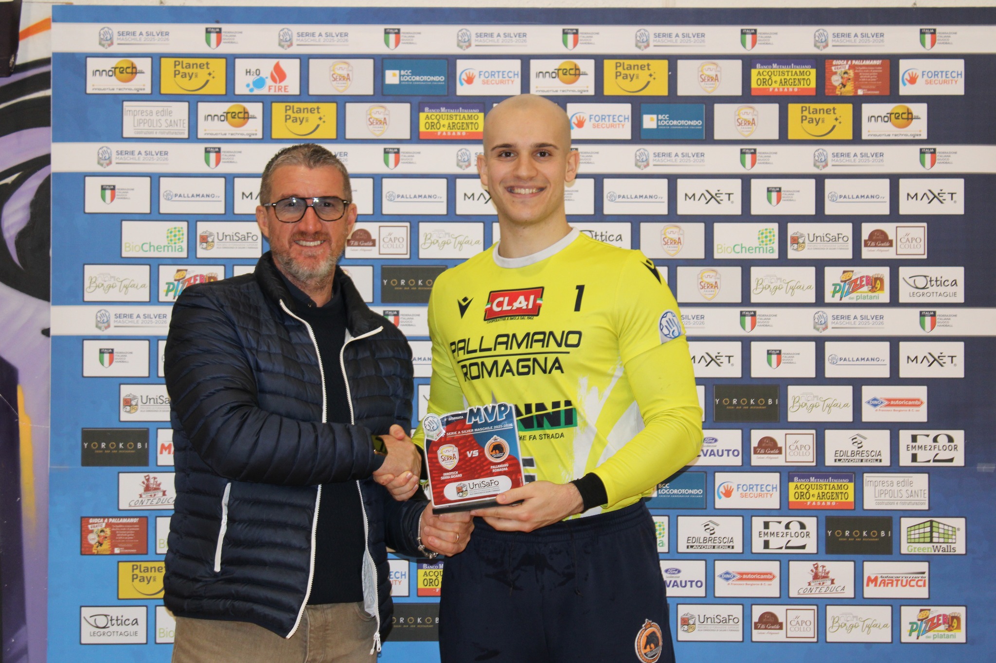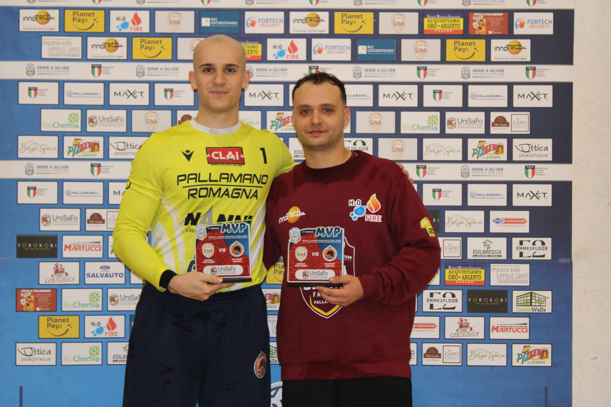 Premio “MVP UniSaFo” dell’incontro a Maistrello per la Pallamano Romagna e a Roberto Bucco per la Innotech, sceltidalla giuria come migliori in campo delle rispettive squadre e premiati da Francesco Guarini, team manager della Innotech Serra Fasano. Entrambi autori di una bella prestazione, con Maistrello autore di una serie di parate che permettevano ai romagnoli di realizzare i due parziali che valevano il match e con Bucco infallibile dai sette metri e migliore realizzatore dei fasanesi insieme a Passiatore.