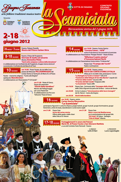 A partire dalle ore 19 il comitato “Giugno fasanese” trasformerà il centro storico di Fasano in un teatro all’aperto nell’ambito della manifestazione “Correva l’anno… 1678”, scene di vita barocca aspettando la “Scamiciata” con dame, cavalieri, artisti, artigiani.