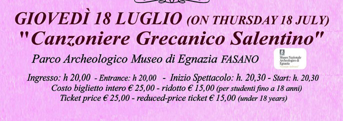 Giovedì 178 luglio, presso il Parco Archeologico di Egnazia, apertura cancelli ore 20 e inizio spettacolo ore 20:30, ci sarà il concerto del Canzoniere Grecanico Salentino.