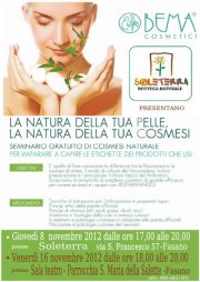 Si terrà venerdì 16 novembre dalle ore 18,30 alle 20,00 presso la Sala teatro della Parrocchia di S. Maria della Salette il seminario gratuito di Cosmesi naturale a cura di Bema Cosmetici e Soleterra Bottega Naturale.