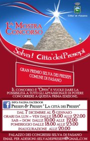 SELVA DI FASANO – Si inaugura venerdì 7 dicembre il Gran Premio "Selva dei Presepi" Comune di Fasano. La mostra-concorso "Open" di presepi tradizionali s terrà presso la Casina Municipale in viale Toledo. info: selvadeipresepi@gmail.com