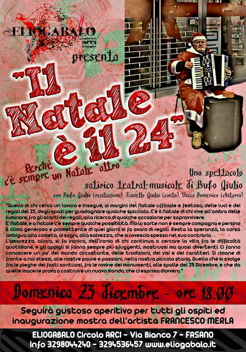 Si terrà domenica 23 dicembre alle ore 18.00 al Circolo Arci Eliogabalo di Fasano lo spettacolo satirico teatral-musicale del molfettese Bufo Giulio Il Natale è il 24 con Giulio Bufo (recitazione), Giulia Fasiello (voce) e Domenico Vacca (chitarra).