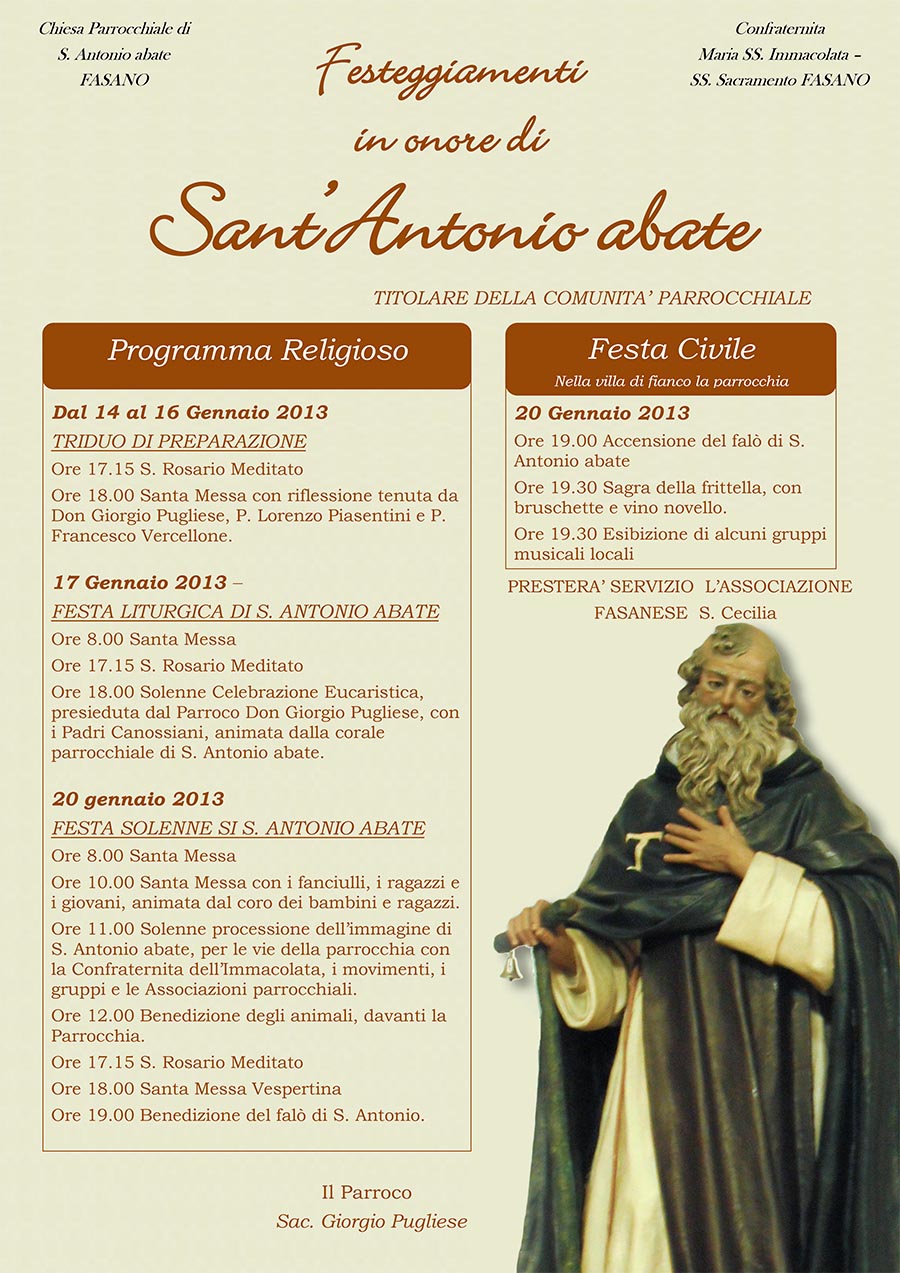 FASANO – La parrocchia Sant'Antonio Abate si appresta a festeggiare nei prossimi giorni il suo patrono. Lunedì 14 gennaio avrà inizio il Triduo di preparazione alla festa con la preghiera del Santo Rosario meditato alle ore 17:15, seguita dalla santa messa vespertina alle ore 18. Il triduo, animato dai gruppi parrocchiali e dalla Corale Sant'Antonio Abate, culminerà giovedì 17 gennaio, giorno della festività liturgica del santo eremita, con la solenne celebrazione eucaristica presieduta dal parroco don Giorgio Pugliese e dai Padri Canossiani.