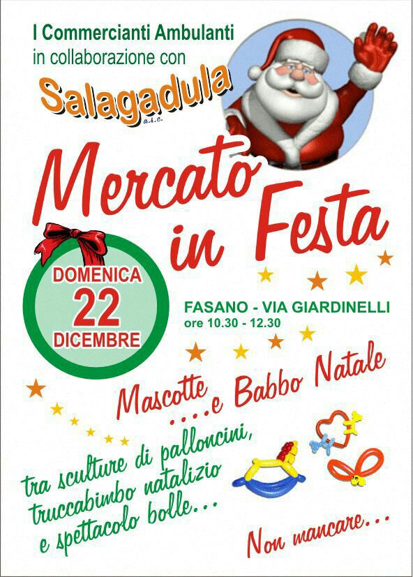 FASANO – Domenica 22 dicembre i commercianti ambulanti, in collaborazione con l’associazione “Salagadula”, organizzano la manifestazione “Mercato in festa”, che si svolgerà in mattinata, dalle ore 10.30 alle 12.30, in via Giardinelli.