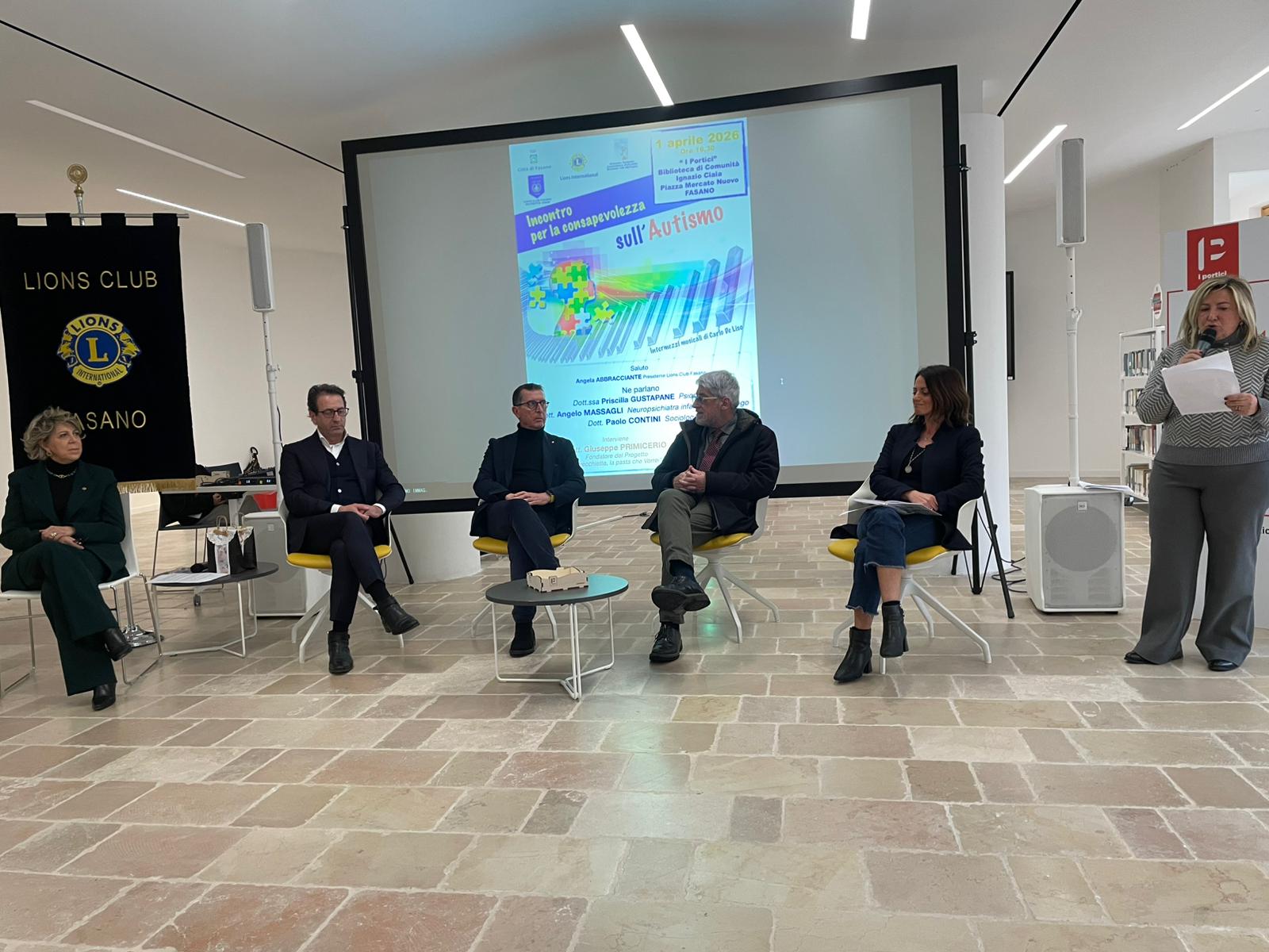 Fasano – Il Lions Club Fasano ha promosso la “Giornata Mondiale della Consapevolezza sull’Autismo” con un incontro organizzato mercoledì 1° aprile nella biblioteca di comunità “Ignazio Ciaia” di Fasano, dove si sono confrontate importanti testimonianze che hanno indagato il vasto mondo autistico, tra esperienze mediche, analisi sociologiche ed esperienze dirette dalla forte intensità emotiva.